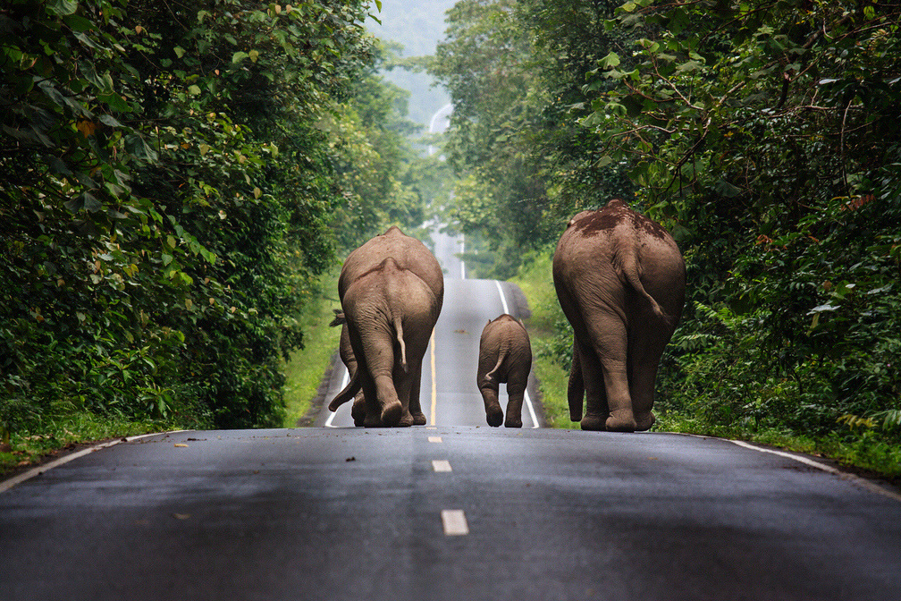 Wild elephants walking up a road in the area of Khao Yai National Park
